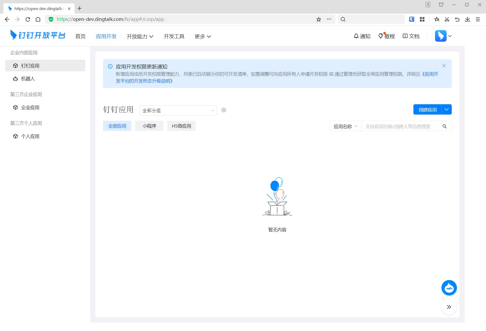 注册登录好账号后 进入钉钉开放平台 > 应用开发
