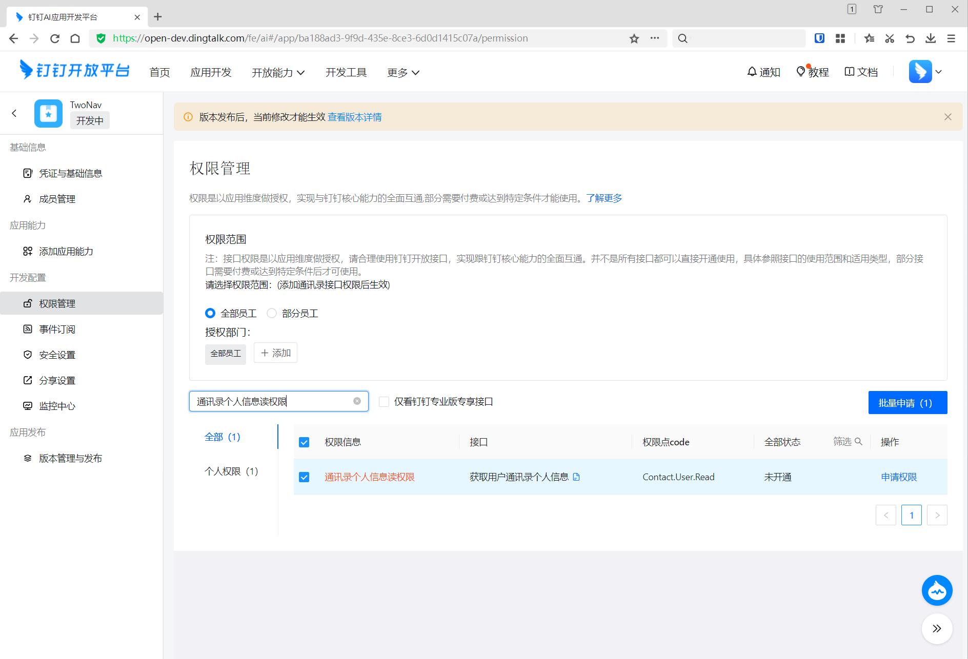 这时候已经可以使用了.但无法获取用户名.需要到权限管理申请通讯录个人信息读取权限 点右边的申请权限即可