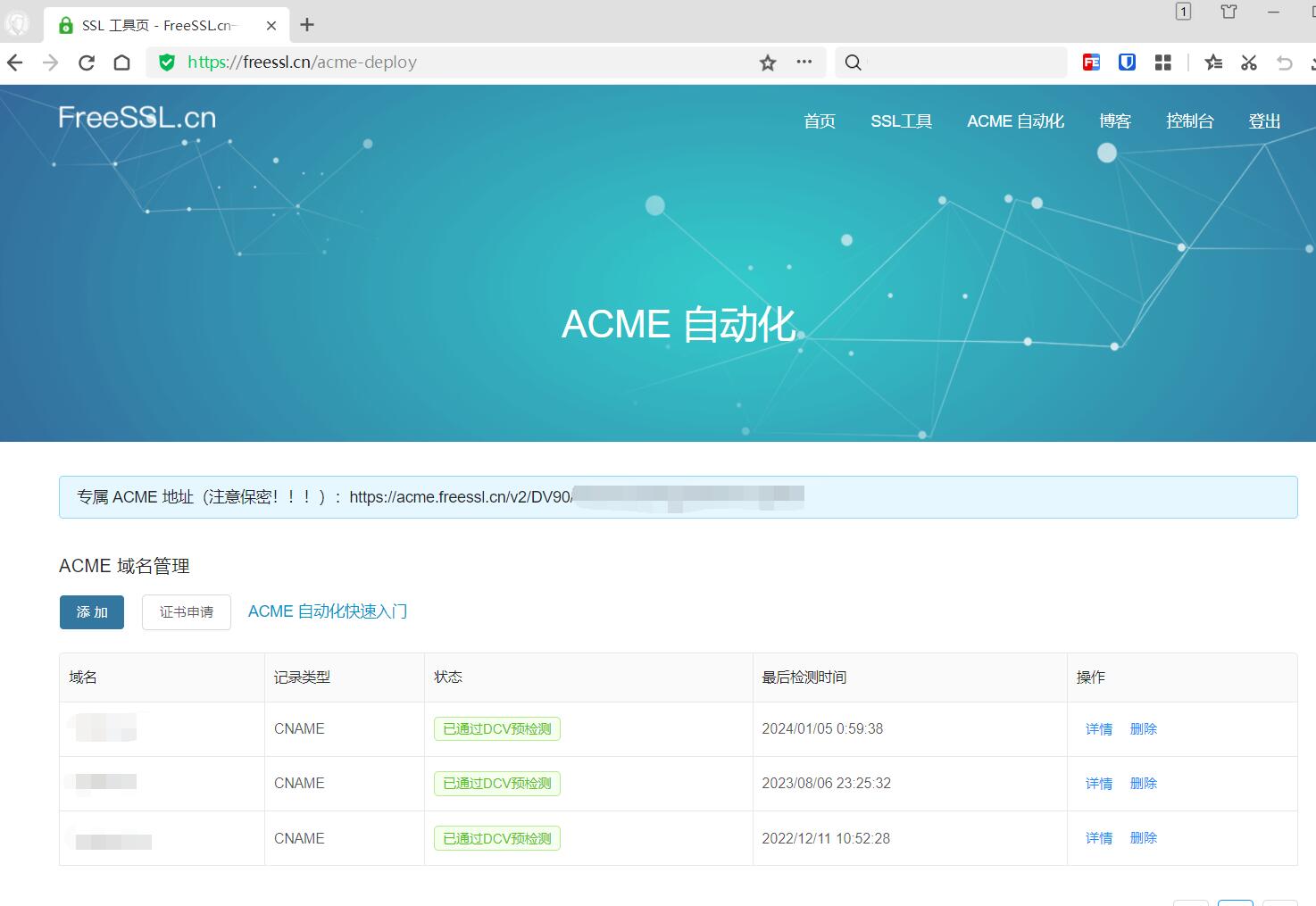 在freessl的ACME自动化>ACME 域名管理 > 添加, 并取得专属 ACME 地址