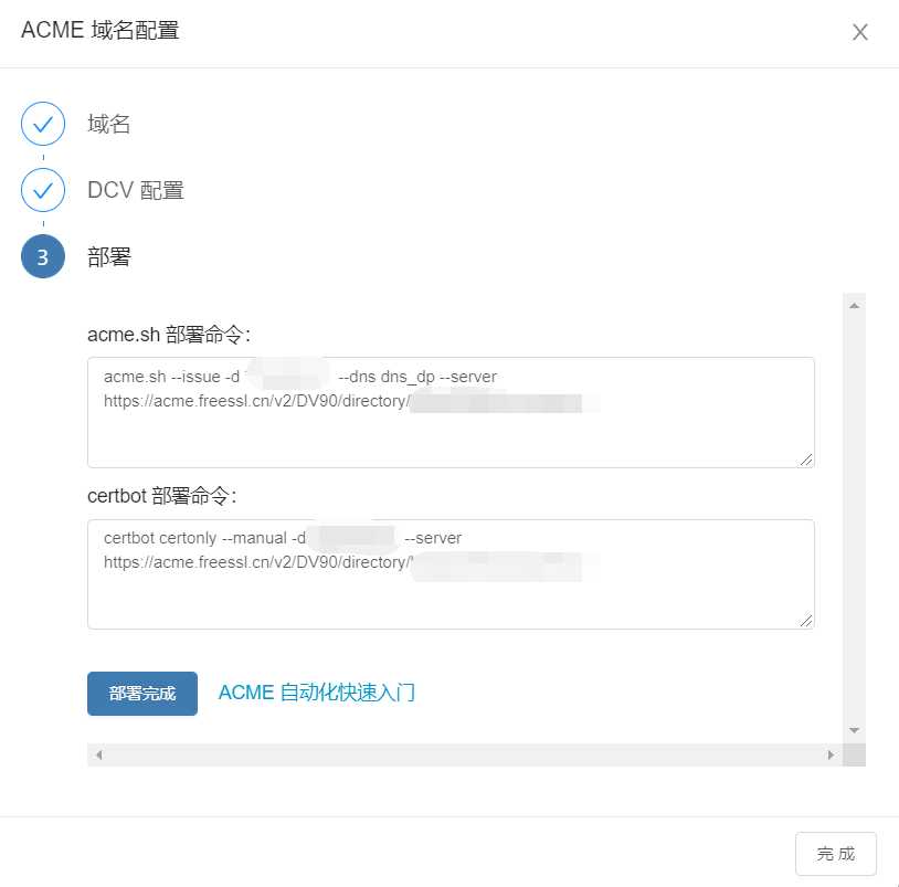 acme.sh --issue -d *.xxx.com --dns dns_dp --server https://acme.freessl.cn/v2/DV90/directory/**************** \ --key-file "/www/server/panel/ssl/privateKey.pem" \ --fullchain-file "/www/server/panel/ssl/certificate.pem" \ --reloadcmd "service nginx reload && bt 1"